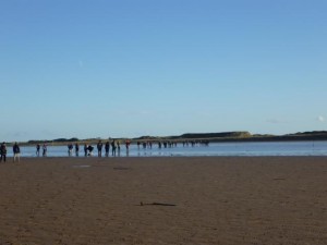 Heute bin ich mit der Hillwalking Society ca. 15-17km von Berwick-upon-Tweed den Strand entlang nach Lindisfarne (Holy Island) gewandert! Nachdem ich um 6.30 Uhr aufgestanden war und mir meine 20 Lagen angezogen hatte, musste ich feststellen, dass sich mein Weißbrot für die anstehenden Strapazen nicht mehr wohl genug gefühlt hat und daher musste ich erst noch mal schnell bei Tesco vorbeischauen – um kurz nach 7am – um mir eine Packung Fertigsandwiches zu besorgen. Anschließend ging es zur DSU, wo der Bus nach Berwick abfahren sollte. Nach ca. 2 ½ Stunden Fahrt und einem kurzen Abstecher nach Lindisfarne – wo die „Lauffaulen“ *ach wär ich doch da ausgestiegen* abgesetzt wurden, kamen wir in Berwick an. Wie ihr wisst bin ich kein Wanderer und schon nach den ersten Metern gehörte ich der Gruppe der Letzten an, weil wir erst noch einmal alle in einem Pub auf der Toilette waren. Diese führende Position verlor ich um ehrlich zu sein für den restlichen Tag nicht mehr…