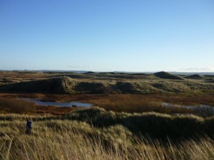 Auf der Insel ging es über mehr oder weniger vorgetrampelte Pfade hügelauf hügelab durch das Dünengras bis wir endlich die Hauptstraße, auf der wir schon am Morgen gefahren waren, gefunden hatten. Ab hier fingen so langsam die Beine an müde zu werden und ich schleppte mich noch total am Ende der Gruppe hinterher. Die Hauptgruppe machte dann endlich Rast, was ich von Weitem sehen konnte und das gab mir Hoffnung. Nun lief es aber so ab wie bei den letzten „Pausen“, dass die Gruppe 10 Meter bevor ich sie erreichte, wieder aufbrach und ich um meine Pause kam. Hier machte ich dann aber mit zwei anderen Wanderern aber doch Pause und ließ die anderen schon mal zum Pub vorlaufen, immerhin mussten wir jetzt nur noch „der Hauptstraße folgen“.