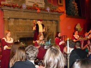 Dann kam ein Mann im historischen Gewand, der sich als Lord Lumley vorstellte und mit uns eine Zeitreise in das Jahr 1506, glaube ich, machte. Wir lernten  alles was wir für den Abend wissen mussten wie zum Beispiel das Lumley Castle Lied und vor allem, dass man kräftig jubeln muss, wenn ihre Majestät die Königin Elisabeth I erwähnt wird. Ein Diener verlas die Namen für die Tische und die aufgerufenen Gäste gingen dann geschlossen in den Festsaal. Der Diener machte immer wieder Scherze über die Namen, die er nicht nennen konnte und entschuldigte sich immer wieder für Versprecher. Als mein Name genannt werden sollte sagte er, dass er in diesem Fall gar keine Chance hätte, den Namen richtig auszusprechen… nie und nimmer. Ich muss ihm zugestehen,  dass es gar nicht so schlimm war. Jedenfalls ging ich dann auch zu meiner Gruppe und ging zusammen mit ihnen in den Festsaal, wo wir an 9 riesigen Tischen und Bänken Platz nahmen.  Vor Kopf und genau gegenüber der Bühne stand der Hightable mit den Ehrengästen – also dem Vorstand der Society.